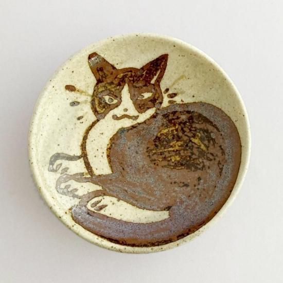 >四寸サイズの小皿に弁柄で猫や草花を描きました。