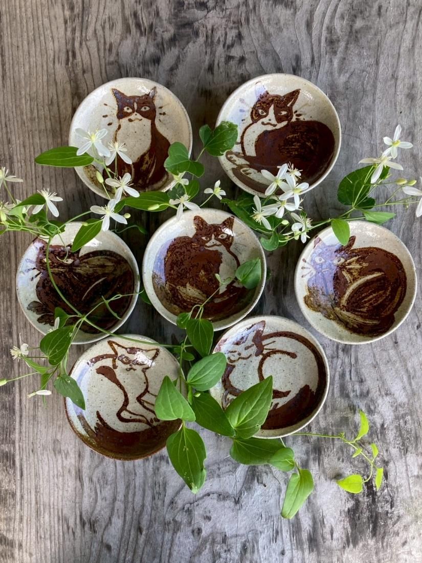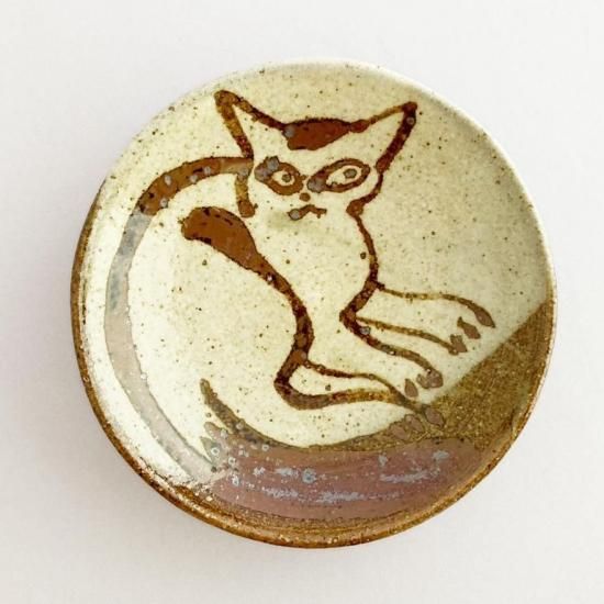 >四寸サイズの小皿に弁柄で猫や草花を描きました。