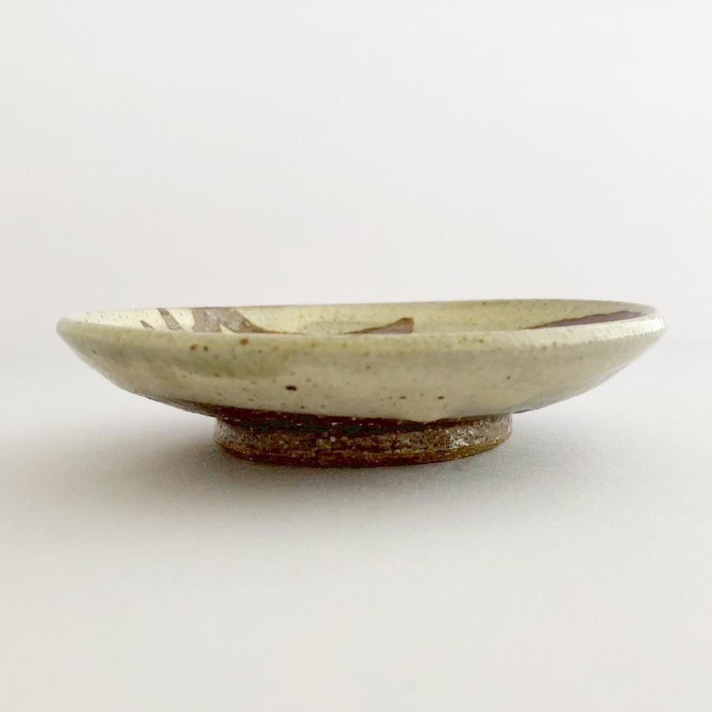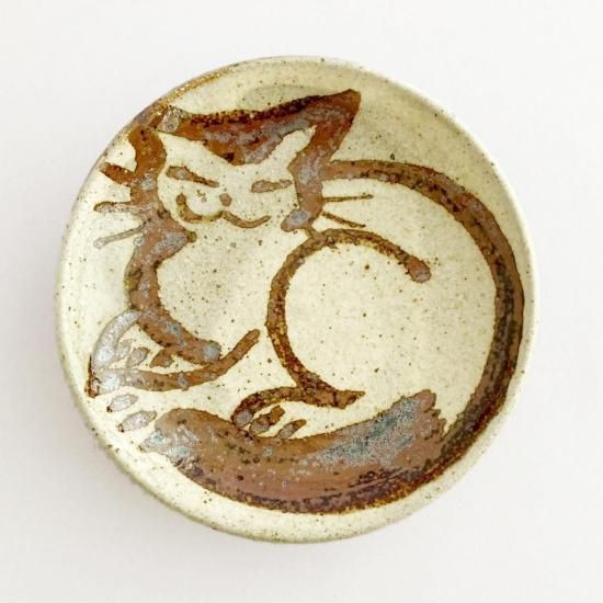 >四寸サイズの小皿に弁柄で猫や草花を描きました。